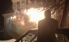 The West German assassin plants a timed explosive charge in Milbank's radio which goes off in the scientist's house. | |||